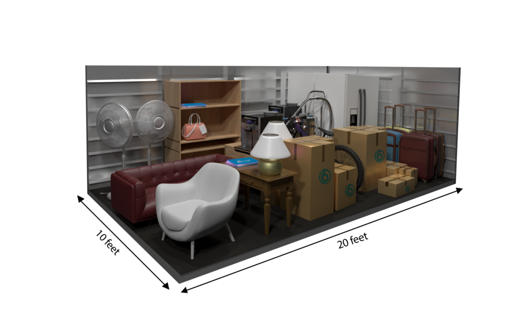 This 200 sq ft storage unit is roughly the size of a standard bedroom, offering space for the contents of a one- to two-bedroom apartment. It can hold larger furniture, appliances, and multiple boxes—perfect for moving, downsizing, or storing extra inventory for your business.