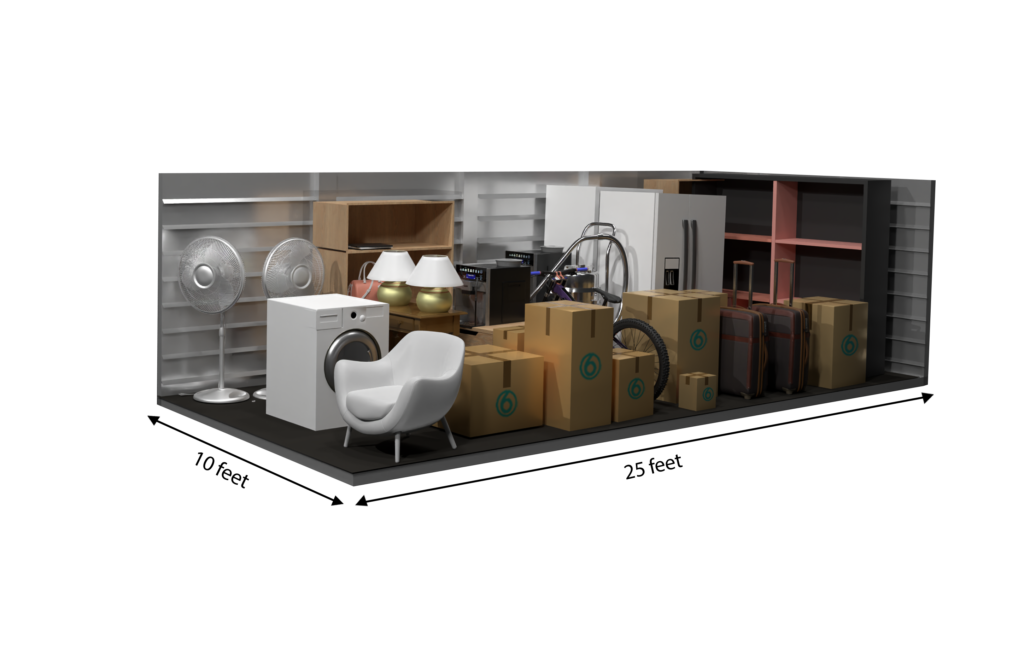 This 250 sq ft storage unit fits the contents of a two- to three- bedroom home – furniture sets, appliances, and lots of boxes—and may also handle large equipment or a vehicle in some facilities. It is ideal for long-term storage, major moves, renovations, or business inventory.